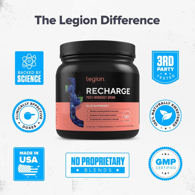 Legion Recharge Post Workout Supplement - All Natural Muscle Builder & Recovery Drink With Micronized Creatine Monohydrate. Naturally Sweetened & Flavored, Safe & Healthy. (Blue Raspberry, 60 Serving)