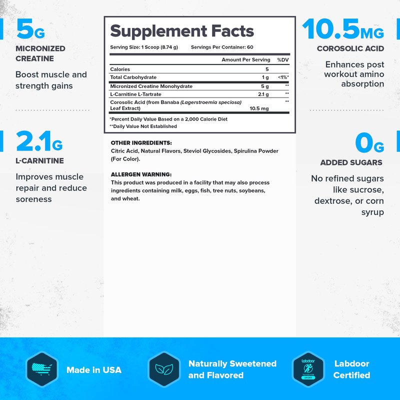 - HELPS BOOST MUSCLE & MAINTAIN STRENGTH. With this post workout recovery drink, you're going to have the support that you need while trying to gain muscle and maintain strength after very workout thanks to creatine powder and L carnitine L tartrate.