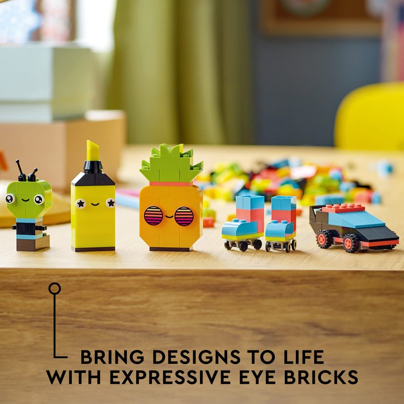 - This LEGO Classic building set includes a box of 333 building blocks in bright neon colours, plus eye elements that allow children to bring their creations to life