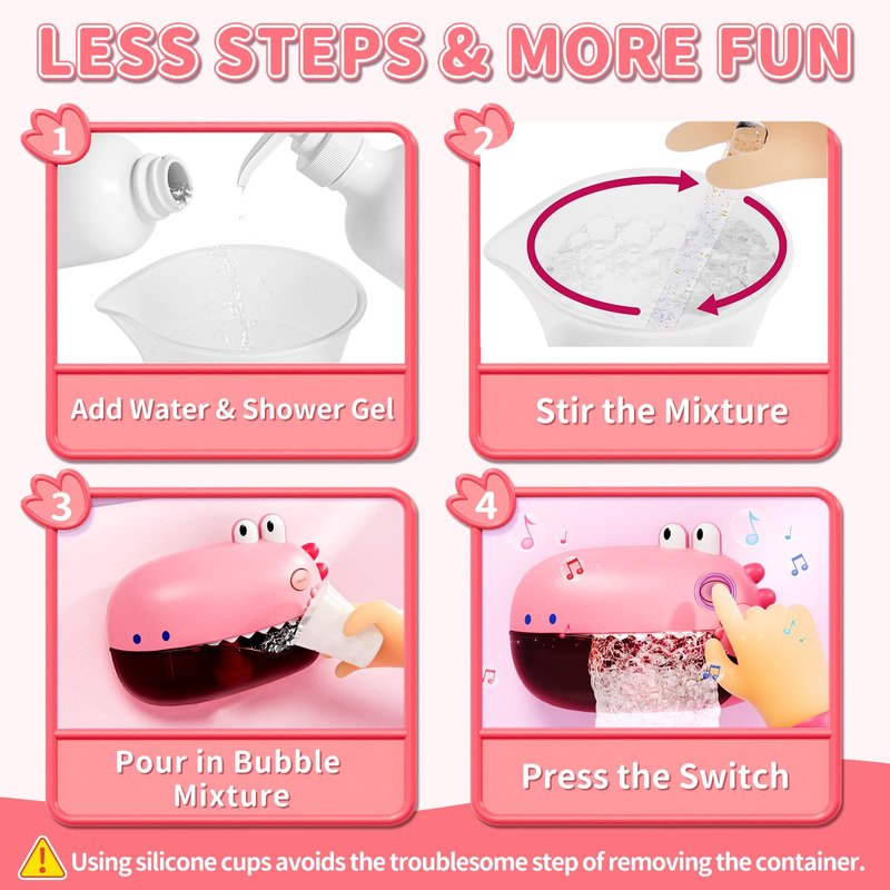- Simple Setp, Maximum Enjoyment - The included compressible silicone measuring cup saves space and simplifies setup. Secure the bubble machine to the bathtub with sturdy suction cups, then pour body wash and water into the measuring cup, mix with the included stirring stick, and pour into the bath toys's container. Save yourself the hassle of disassembling containers and buying specialized bubble solution. More fun, less prep!