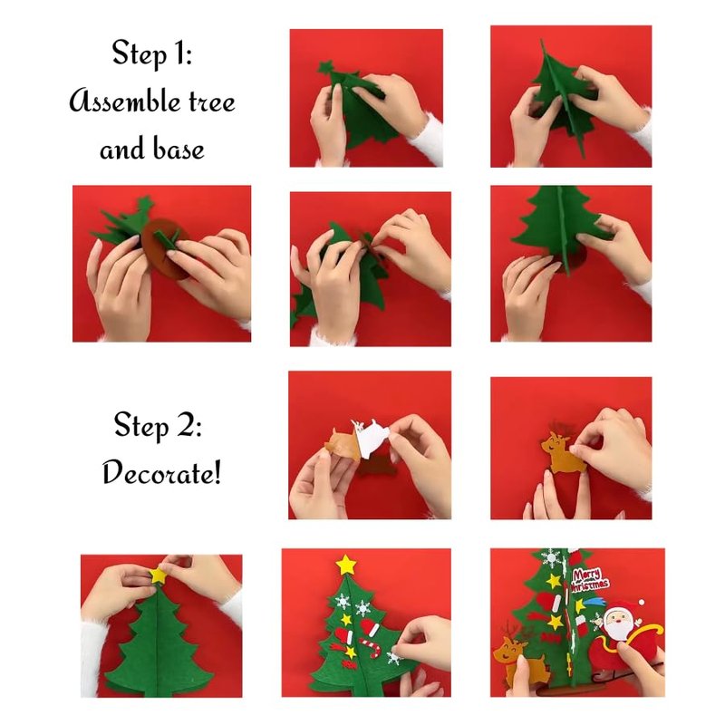 Bring the magic of Christmas into your home with this delightful felt art activity! Perfect for small spaces or vacations away from your traditional Christmas tree, this kit allows you to build your own miniature tree that can be displayed on a table or shelf. It's a great way to get the kids involved in festive crafting and let them create their own unique tree. The set includes a Santa Claus figure, reindeer, and a snowman, adding extra charm and functionality. With its compact size (approximately 9 inches tall), this felt tree is ideal for apartments, dorms, or as a supplementary decoration. Unleash your creativity and make lasting memories with this fun and engaging Christmas felt art activity!