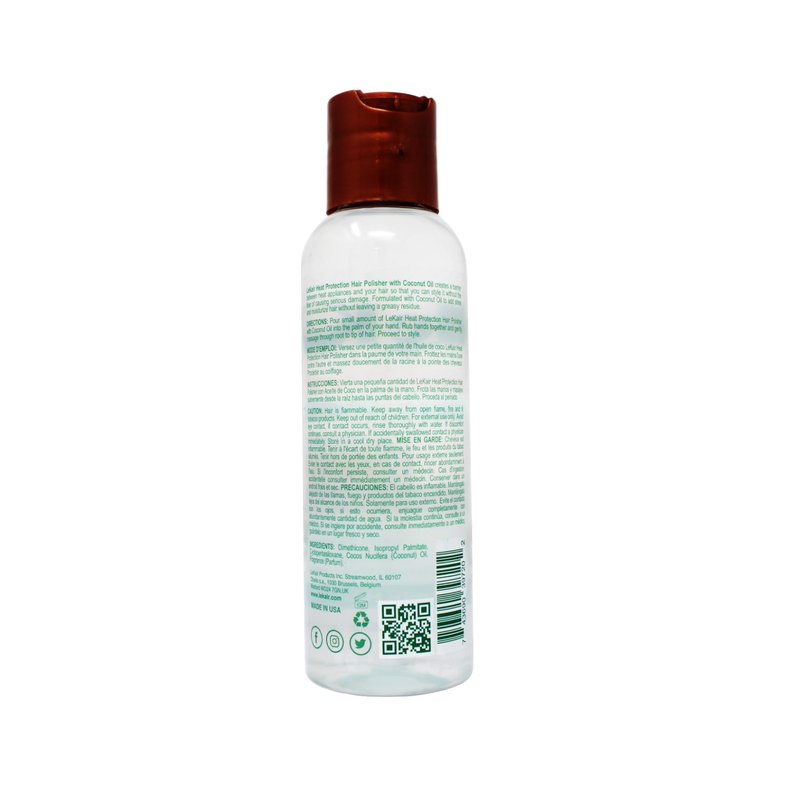 LeKair High Heat Protection Hair Polisher with Coconut Oil creates a barrier between heat appliances and your hair so that you can style it without the fear of causing serious damage. Formulated with Coconut Oil to add shine and moisture hair without leaving a greasy residue. Directions: Pour small amount of LeKair High Heat Protection Hair Polisher with Coconut Oil into the palm of your hand. Rub hands together and gently massage through root to tip of hair. Proceed to style.
