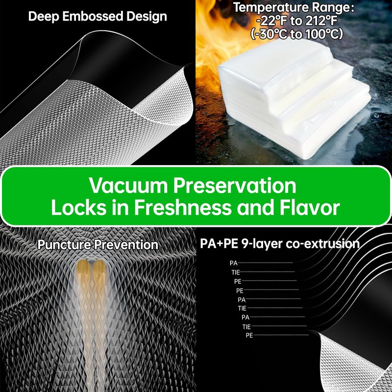 - 👍【Good Compatibility】Machine Compatibility: Most well-known vacuum sealer brands support the use of embossed vacuum bags, such as Foodsaver, Breville, Anova, etc. Reusability: Our embossed vacuum bags can be reused after cleaning, which enhances their practicality and economy.