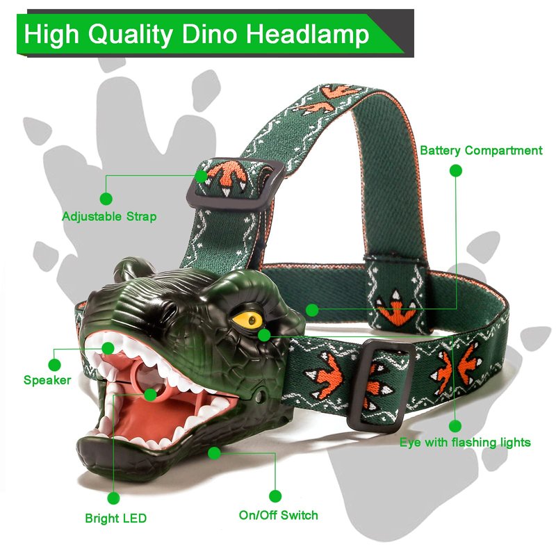 - [Realistic dinosaur roaring] Realistic T-rex appearance and realistic T-rex roar keep children so excited. It's one of the best headlamp for boys outdoor activities
