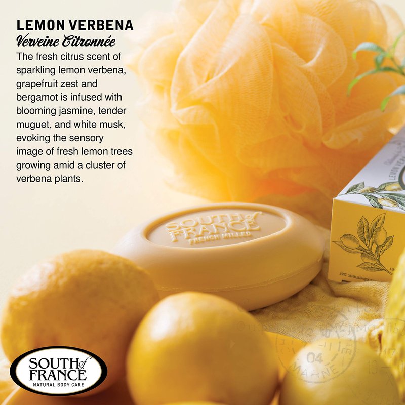 Lemon Verbena Clean Bar Soap by South of France Clean Body Care | Triple-Milled French Soap with Organic Shea Butter + Essential Oils | Vegan, Non-GMO Body Soap | 6 oz Bar – 4 Pack - South of France Lemon Verbena Soap is a French milled oval soap that promotes natural body care. Experience the tenacious fragrance of freshly picked verbena, known for its sharp citrus scent - Infused with the energizing, citrusy zest of lemon verbena leaves. Make time for you, too. Work up an ultra-moisturizing lather for an all-over body clean with an energizing scent. South of France's bar soap is a long-lasting, plant-based signature bar that leaves skin soft and happy. Warnings: Natural colorants may fade over time. Avoid eye contact.