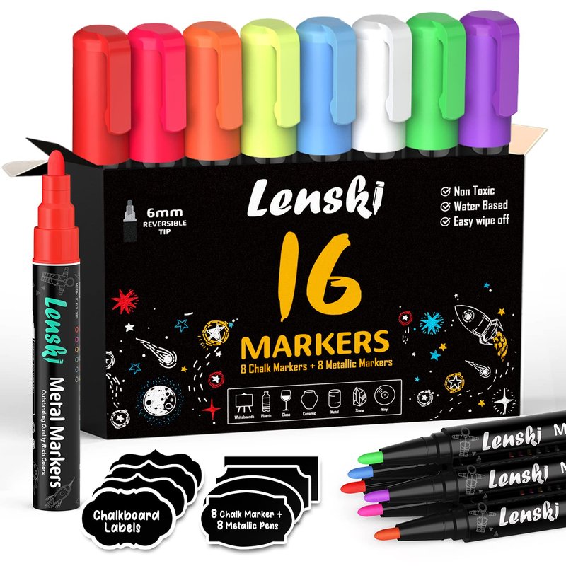 Lenski Chalk Markers, 16 Chalkboard Markers, Washable Markers, Easter Egg Decorating Kit, Liquid Chalk Markers for Glass, Chalk Markers for Chalkboards Windows Menu, School Supplies Accessories