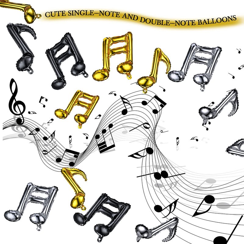 - Nice party supplies: the package contains 30 pieces music note balloons in 3 colors, including: 5 x black single note music aluminum film balloons, 5 x golden single note music aluminum film balloon, 5 x silver single note music aluminum balloons, 5 x black double-note music aluminum balloons, 5 x golden double-note music aluminum balloons, 5 x silver double-note music aluminum balloons, ample quantity is enough for your parties