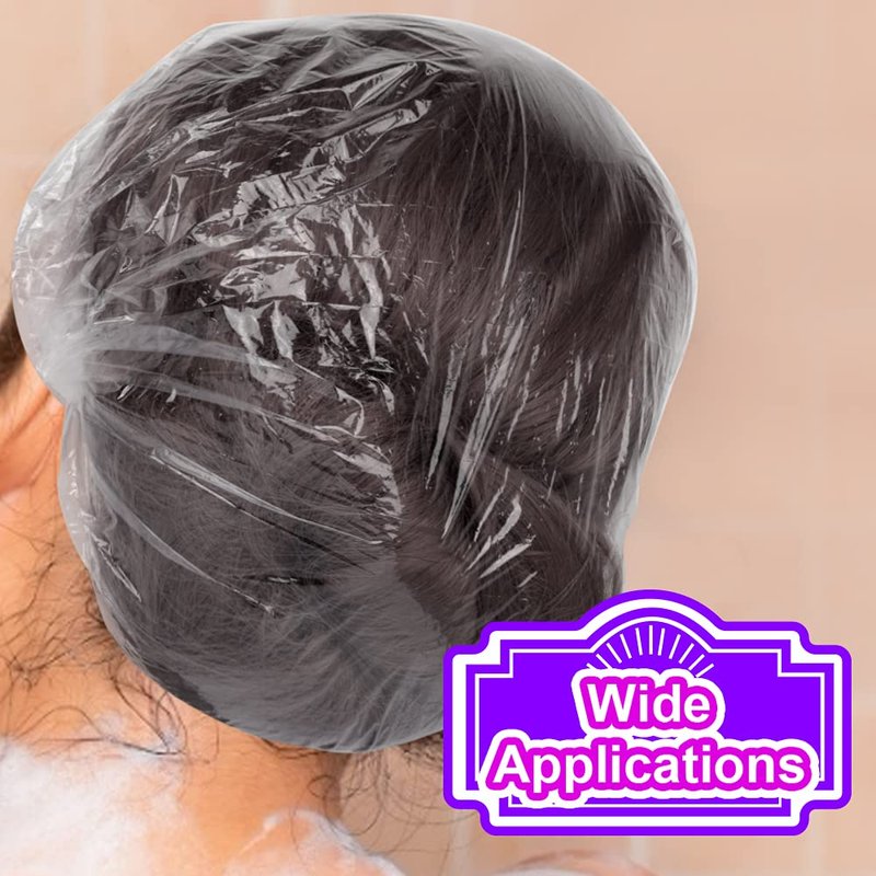 - Multipurpose Shower Caps: Fantastic large disposable shower caps for women, men, girl. Perfect plastic caps for hair treatment, hair deep conditioning, hair dyeing. Organize and protect your hair when doing face care, spa, salon, having spray tan, cooking, cleaning house, painting wall. Ideal guest supplies for hotel, beauty salon, workshop. Also great choice for covering food like fruit and dough, shoes, hat, bicycle seat, remote control, and so on.