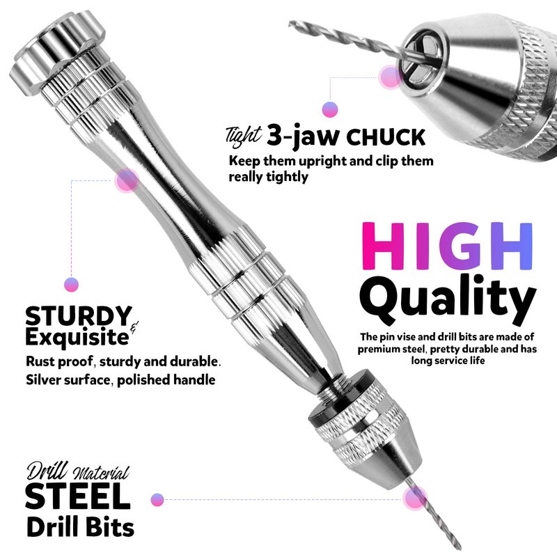 - Well-made Steel Hand Drill: 12cm/4.7inch stainless steel hand drill, sturdy and long-lasting. Precisely designed 3-jaw chuck, clamp the drill bit uprightly and firmly. With rough texture on turning parts, prevent fingers from sliding and make rotation easier. Shiny silver look, classic and graceful.