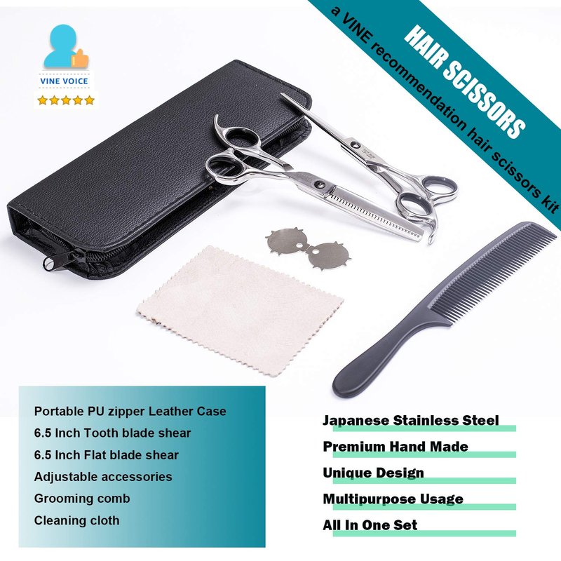 - All In One Set - Portable PU zipper Leather Case, 6.5 Inch Tooth blade shear, 6.5 Inch Flat blade shear, Adjustable accessories, Grooming comb, Cleaning cloth. Come with the case and all in one spot and not getting lost. Easy to carry and store.