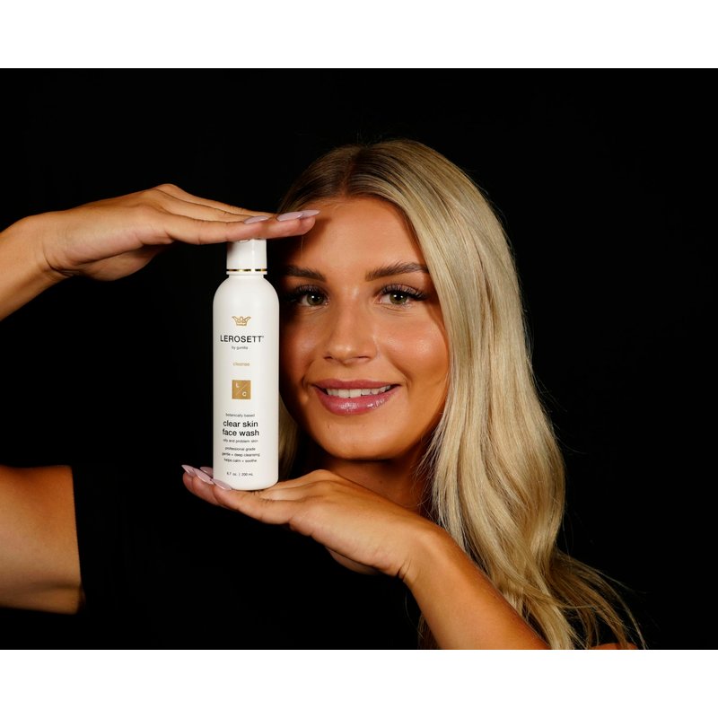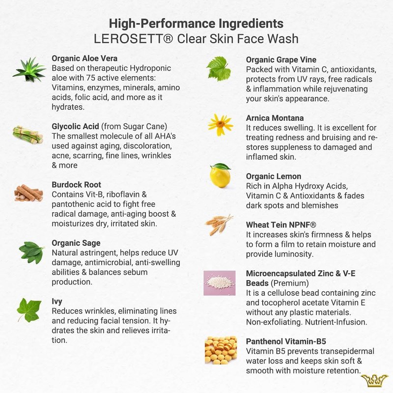 LEROSETT Face Wash for Clear Skin, Gentle Exfoliating Cleanser, Targets Pores, Blemishes & Oily Skin, Plant-Based, 12 Botanicals, Glycolic Acid, Softens Skin, Vegan, Non-Drying - 60-Day 6.7 oz.