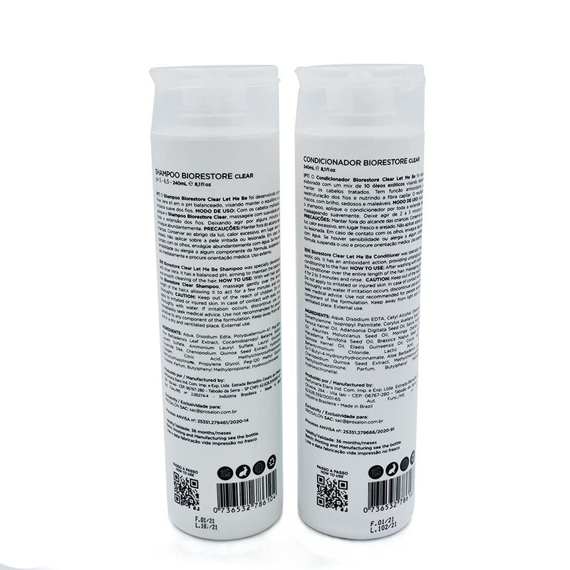 Desarrollado para cabello dañado. El kit Biorestore Clear Duo devuelve la hidratación perdida a un cabello más suave, brillante y resistente. Formulado con activos capaces de penetrar profundamente en la fibra capilar, repone la hidratación perdida por las agresiones químicas y mecánicas. Además, reduce el volumen y el frizz. Consigues un cabello renovado, fuerte y saludable con el cuidado diario. La línea es ideal para quien quiere un tratamiento diario, rellena las zonas dañadas en el interior de la fibra. Acción acondicionadora, reduce volumen y aporta brillo intenso, suavidad y protección térmica. Solicitud Aplique Hair Shampoo sobre el cabello húmedo y masajee el cuero cabelludo y el cabello con las yemas de los dedos durante 2 minutos. Enjuague y repita la operación. Poco después, pasar el Acondicionador sobre el largo y las puntas del cabello limpio y húmedo. Déjelo actuar por 2 minutos y enjuague completamente. Resultado Cabello delineado, protegido, brillo intenso y mucha suavidad. Contenido del paquete · 01 Champú Let Me Be Biorestore 240ml/8.11 fl.oz · 01 Acondicionador Let Me Be Biorestore 240ml/8.11 fl.oz