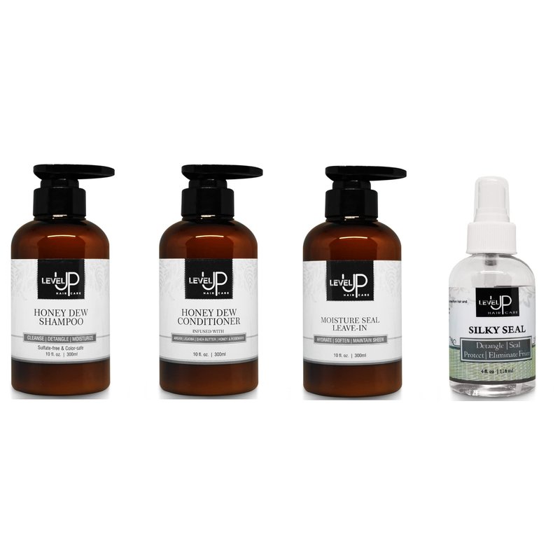 Level Up Haircare Ultimate Package Honey Dew Shampoo and Conditioner with Moisture Seal Leave-In and Silky Seal Safe for All Hair Types and Human Hair Wigs Weaves Extensions