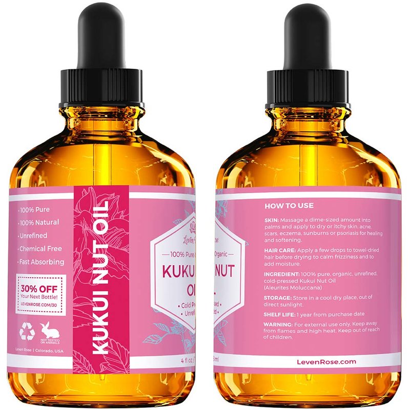 - Miraculous Kukui Nut Oil: Invest in your daily and night skincare routine with Leven Rose 4 oz kukui nut face, scalp, and hair oil. It features dark amber glass that protects the oil from spoiling and a dropper for precise and comfortable application.