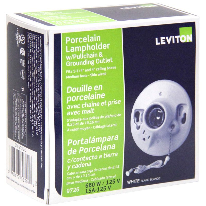 Leviton 9726-C One-Piece Glazed Porcelain Outlet Box Mount, Incandescent Lampholder, Pull Chain, Top Wired, White