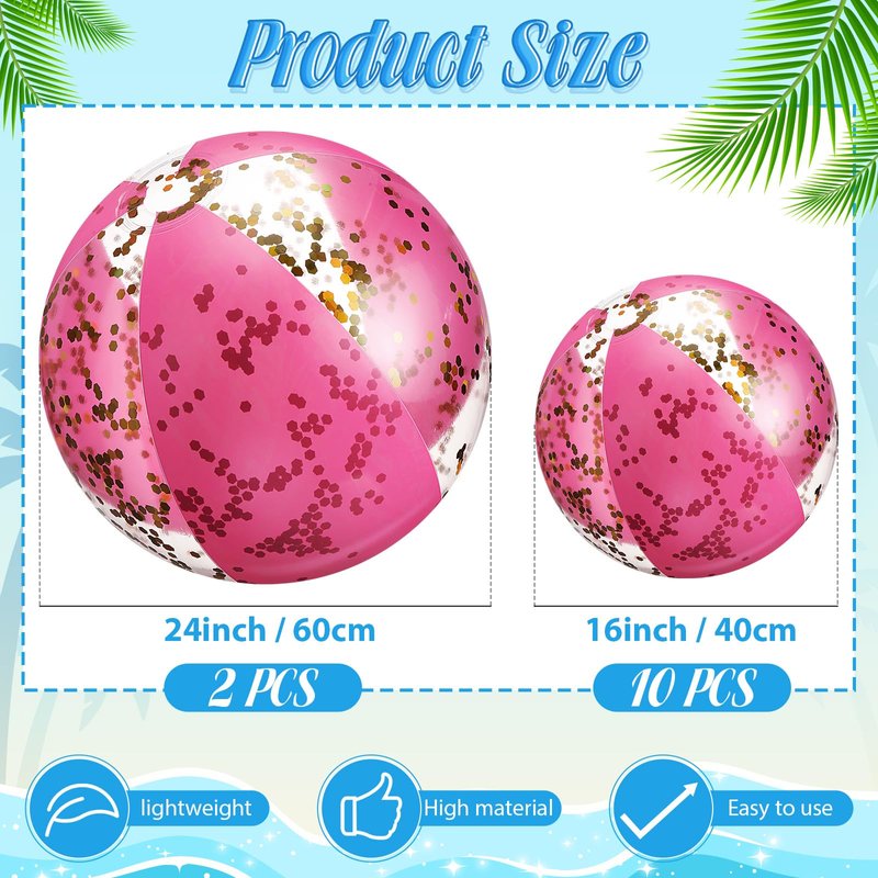 - Glitter Confetti Beach Ball: you can get 2 pieces 24 inch huge beach balls and 10 pieces 16 inch clear beach balls, all with glitter confetti inside, 12 pieces with 2 sizes could satisfy your needs of playing even as decoration, or play with your partners and family