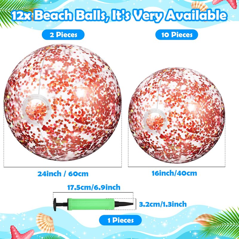 - Glitter Confetti Beach Ball: you can get 2 pieces 24 inch huge beach balls and 10 pieces 16 inch clear beach balls, all with glitter confetti inside, 12 pieces with 2 sizes could satisfy your needs of playing even as decoration, or play with your partners and family