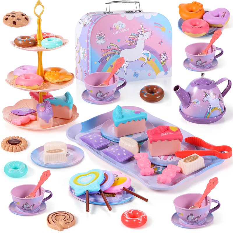 - Safe and Reliable Quality: your child's safety always comes first; This tea party set for little girls is made of non toxic tin coated iron, and the dessert accessories are made of quality PP and PS, safe and durable for use; Keep bringing endless joy to your children