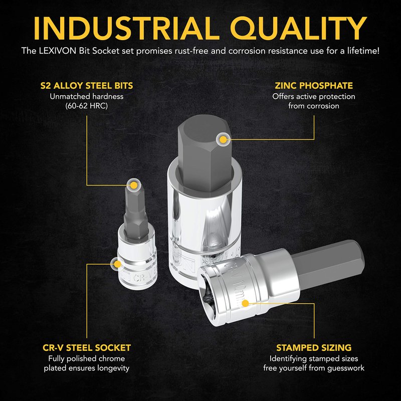 - LONGEVITY - Complete rust and corrosion resistance with fully polished, Chrome plated mirror finish sockets and Zinc Phosphate bits treatment.