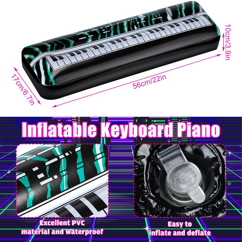 Features: The blow up instruments have a valve that allows you to inflate in minutes to start your party right away, and deflate them for next use when you don't want to. The rock star toy is attractive and safe, so you can give it as a gift to neighbors, colleagues, relatives, family who will host a retro themed party. Specifications: Material: PVC material Color: white and black Size: about 56 x 17 x 10 cm/ 22 x 6.7 x 3.9 inch Package includes: 2 x Inflatable keyboard piano Notes: Manual measurement, please allow slight errors on size. The color may exist a slight difference due to different screen displays. Not suitable for people younger than 12. Air pump not included. Do not over inflate the guitar, and keep it away from heat, fire and anything pointed.