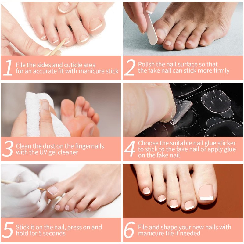 - 【Easy to Use Press ons Toe Nails】The fake toe nails and glue sticker tape are packaged together, easy for DIY and carry. The press on nails are easy to wear and remove. It's suitable for most occasion such as daily life, travelling, beach sunbathing, dating, wedding, dancing, party, performance, etc..