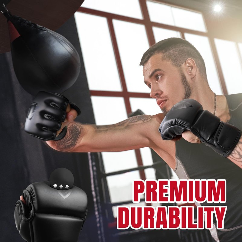 - đ„ăPremium PU Leatheră: 0.8 mm synthetic leather promises long-life, durability and maximum performance of these MMA gloves,martial arts bag gloves against wear and tear. The material is durable and easy to clean. These grappling gloves and mma sparring training gloves are engineered for long-lasting high performance.