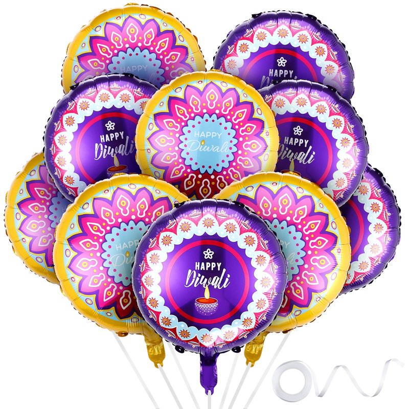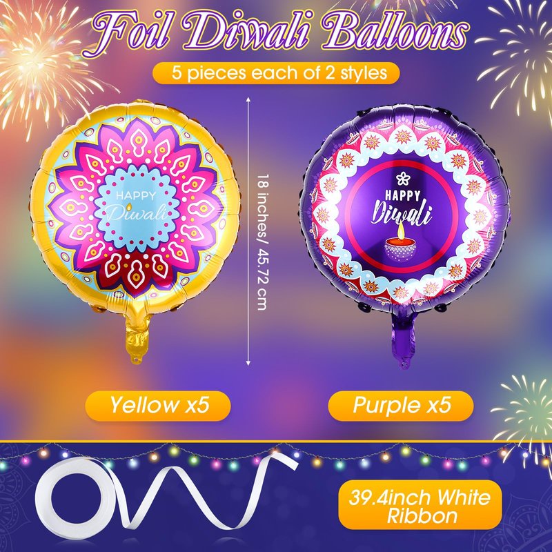 - Nice Decoration: you will receive 10 pieces of Diwali foil balloons, and 1 roll of white balloon ribbon; The balloons come in 2 different colors and pattern designs, purple and yellow, 5 pieces for each, a nice combination to satisfy your Diwali party decoration needs