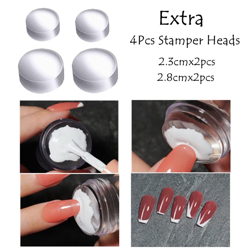 - 1. Nail Art Stamper Kit: Come with Dual Head Nail Stamper & Extra 4pcs replaceable clear stamper heads & 1 Scraper, Suitable for Dual Head Nail Stamper;