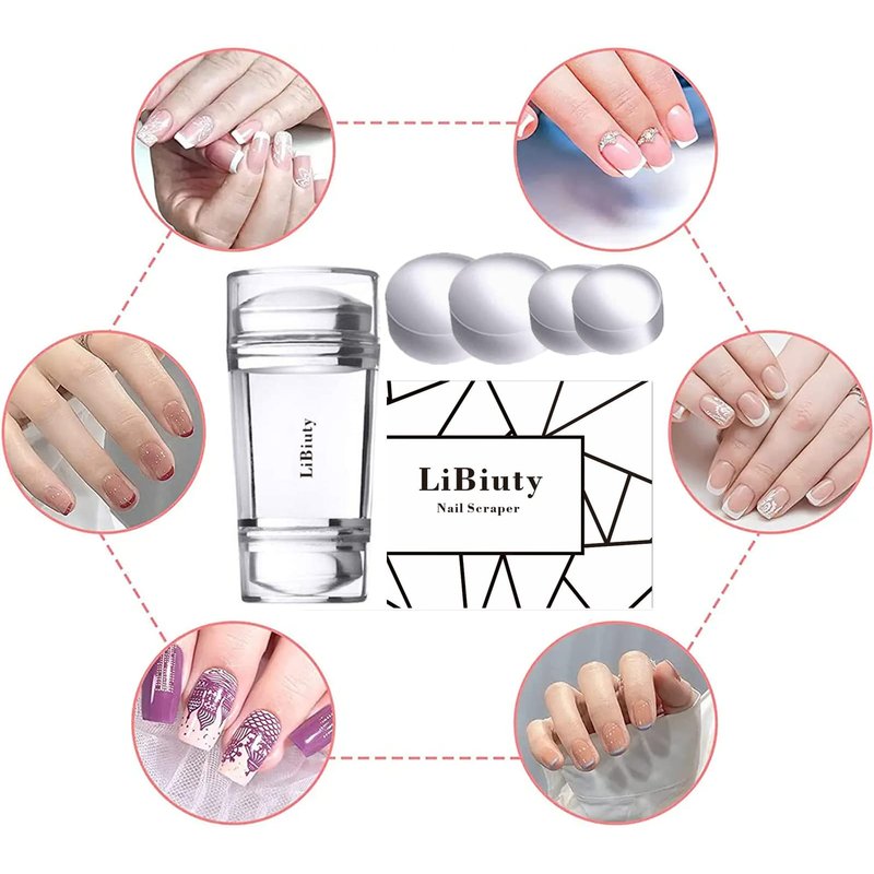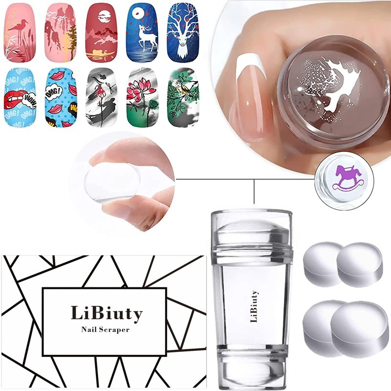 LiBiuty Nail Art Stamper, Dual Head Clear Jelly Nail Polish Transfer Stamper with Extra 4Pcs Silicone Heads & 1 Scraper Nail Stamping Tool