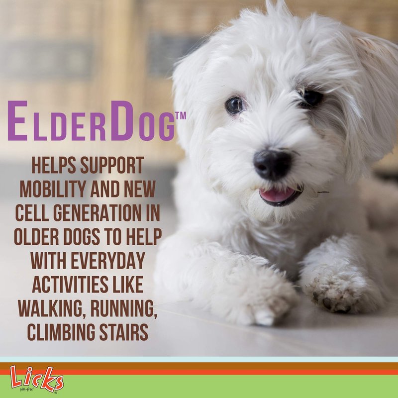Continue giving your senior dog excellent care and love with Licks Pill-Free ElderDog Small Breed Dog Senior aiding supplement. This older dog supplement provides support in their mobility, digestion, and immune system. These dog health supplies for mature dogs support their aging joints. The delicious gel packets can support your dog's regular digestive function. As your furry family member ages, you want to make sure that they look as beautiful as they did when you adopted them. This dog coat supplement supports your aging dog's coat health. The advanced age dog formula provides the necessary nutrients to support their body’s natural joint health, immune system, digestive function, and heart health.