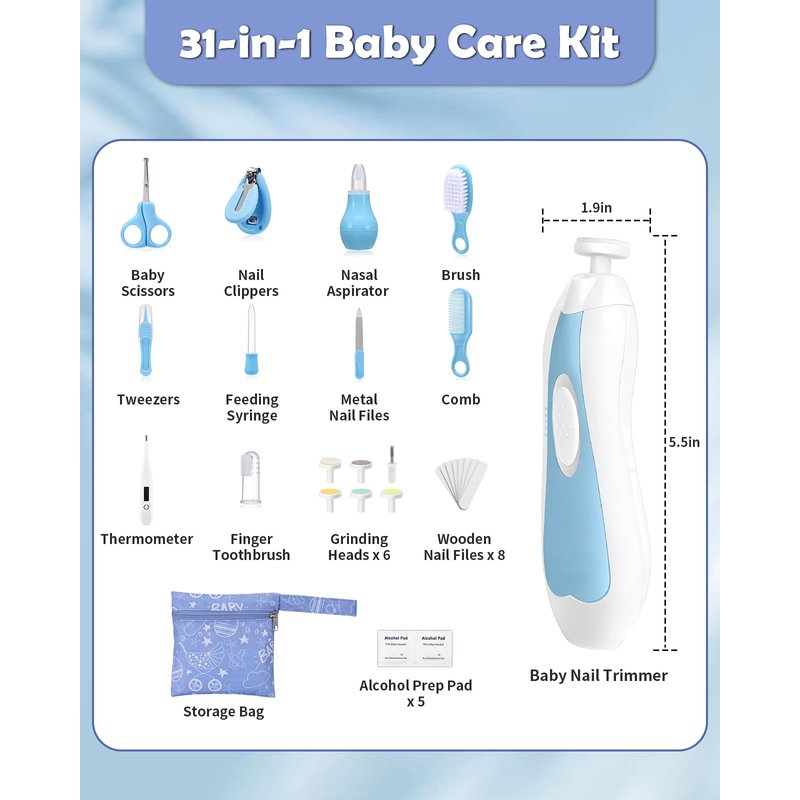 - 31 in 1 Baby Essentials for Newborn - Lictin baby healthcare and grooming kit offers a comprehensive selection of essentials, including a comb, hairbrush, tweezers, nail clippers, electric nail trimmer, 8 wooden nail files, metal nail files, nasal aspirator, thermometer, medicine dropper, finger toothbrush, round-tip scissors, storage case, 5 alcohol prep pads, and 6 grinding heads, among others. This kit is thoughtfully designed to meet the daily needs of your baby