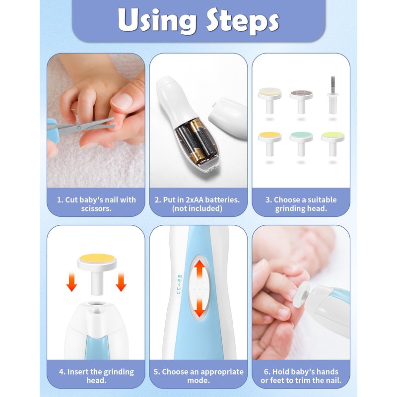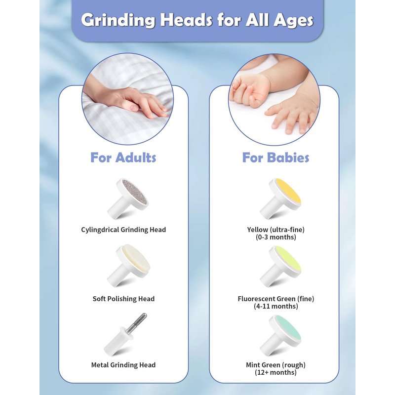 - Electric Nail Trimmer with 6 Grinding Heads - Lictin baby electric nail trimmer comes with 3 colored sandpapers to cater to different stages of babies' growth. Furthermore, the kit includes 1 cylindrical grinding head, 1 metal grinding head, and 1 soft grinding head for adults. This versatility allows the nail clippers to be used for newborns, infants, toddlers, kids as well as adults
