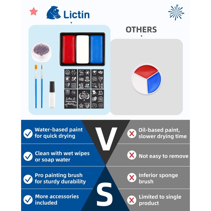 Lictin Red White Blue Face Paint Kit, 3 Color Water-Based Patriotic Face Paint with Glitter, 30 Stencil Stickers, USA Flag 4th of July Face Paint for Independence Day, Halloween Cosplay, Veterans Day