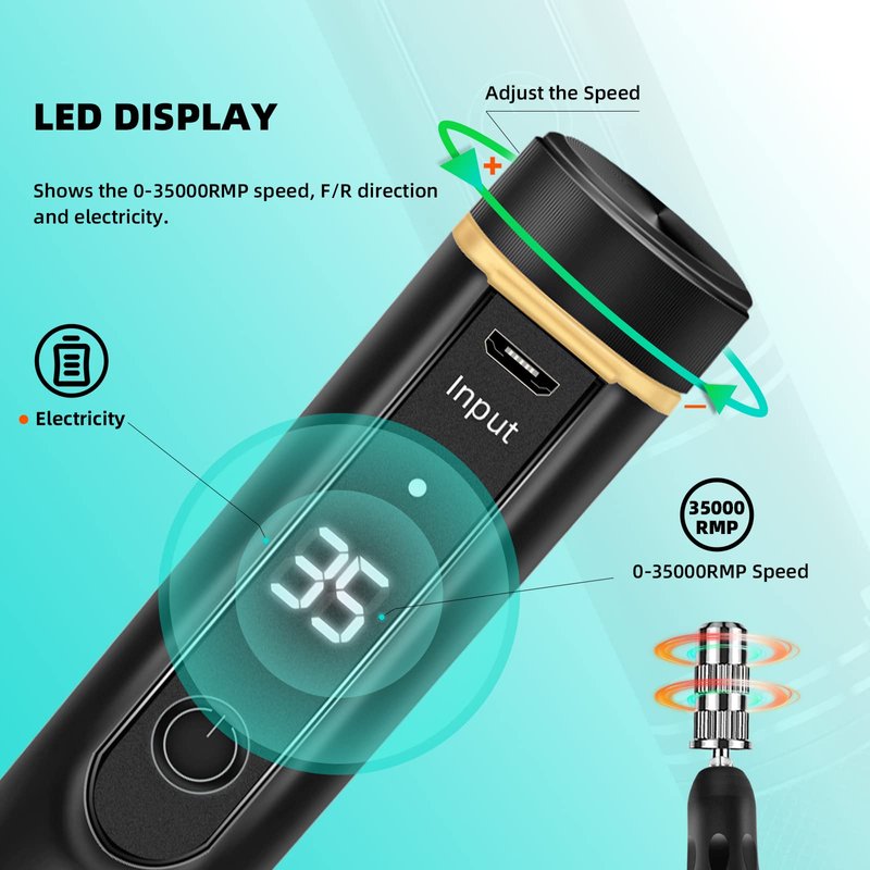 - 💅 Led Display Screen - The smart Led screen will display the RPM, forward and reverse(F/R) directions, and electricity, which makes this electric nail file safer, efficient and user-friendly. Two directions for left-hand and right-hand use, It can make easily sand, shape, engrave, cut, polish, remove nail gel polish and cuticles Layer.