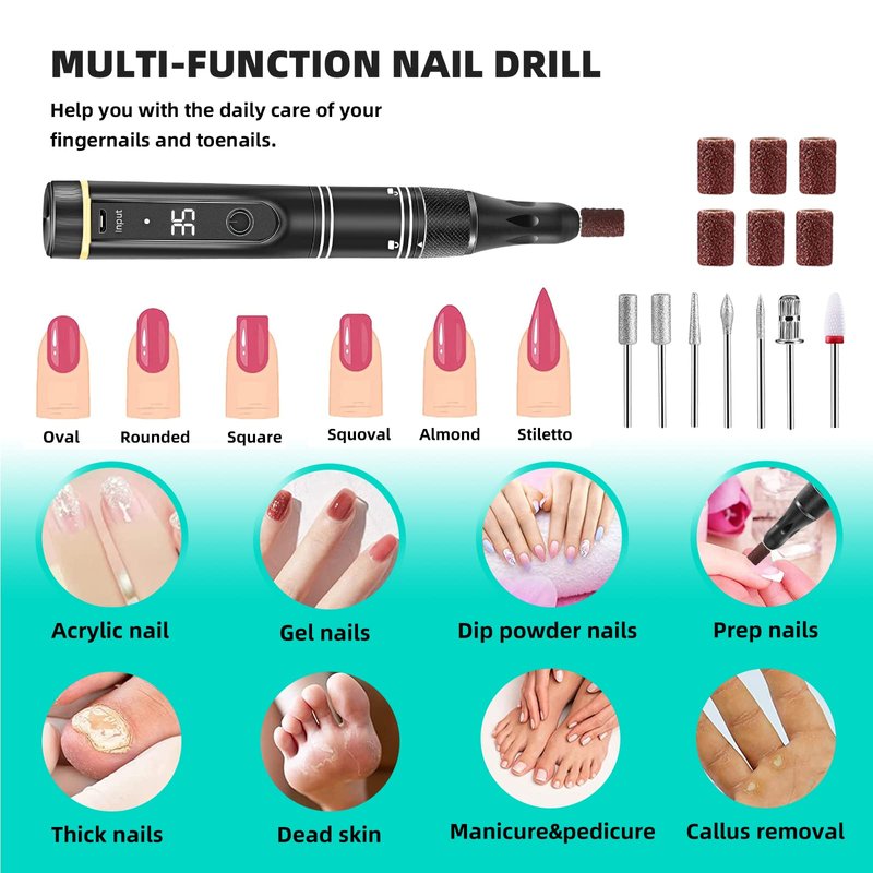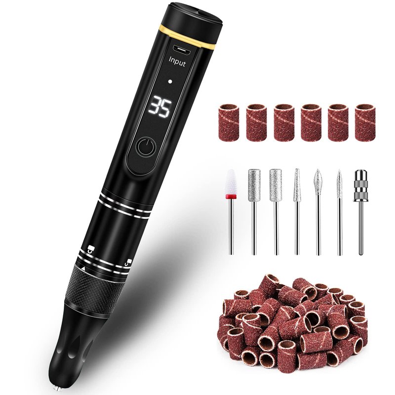 LIERKISS Cordless Electric Acrylic Nail Art Drill Remover Machine with Low noise & Low vibration & Low Heat, LCD Display is perfectly used in spas, beauty parlors as well as personal use in homes. It can file our nails easier and quicker, it also helps us get salon grade nails at home. We can save a lot of time for appointment for nail salon and save a lot of money for acrylic gel nails. Perfect Gift for Christmas, Thanksgiving Day, New Year, Birthday,Valentine's Day. Features: * Salon quality, Easy to operate. * The LED display on the e-file handpiece allows you to easily check the F/R direction (forward or reverse), remaining power and variable speeds (0-35000 RPM ). * Adjustable speed and 7 different nail bits for different demands * 0-35000 RPM continuously variable speed switching. * Low noise, low heat, low vibration for long-time and portable compact. You can easily use the nail drill and change the nail drill bit. * Light-weight design handpiece for precise operation * Forward and reverse operation switch * Suitable for pedicure and manicure, removing thick nails, calluses, dead skin and natural nails. * For professional salon and home use. * Safe and powerful for drilling, cutting, grinding, shaping, carving, sanding acrylic nails, dipping nails, gel nails and various nail gel polish, perfect for manicurist and beginners. Specifications: Speed: 0-35,000 RPM (Adjustable) Charging time: 2 hours Working time: 7 hours Suitable for 3/32 "drill bits Package 1x Nail Drill Machine 1x USB charging cable 1x Ceramic Nail Drill Bits 1x Instruction Manual 6x Drill Bits 36x Sanding Bands