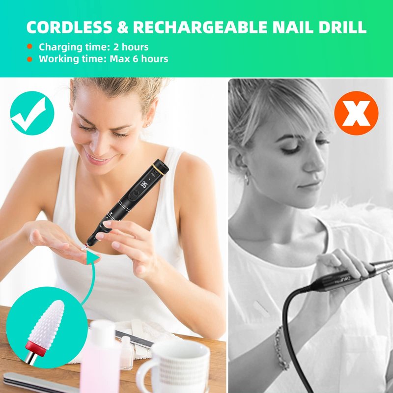 - 💅 Long-Lasting Rechargeable Battery - The nail drill cordless for acrylic can work 6 hours of manicure time after 2 hours to charge fully. Nail drill rechargeable supports manicuring while charging. This acrylic drill brings you a perfect experience whether used it on Acrylic Nails, Gel nails, Manicure or Pedicure, Thick Nails, Dead Skin, Callus Removal ect.