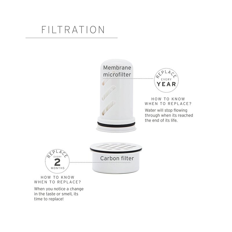 - The membrane microfilter lasts 264 gallons (1 year with regular use). The activated carbon + ion exchange filter lasts up to 40 gallons (2 months with regular use)