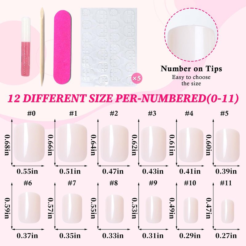 - Nude press on nails square pack: Including 240pcs glossy nude nails press ons, with 1* nail sticks, 1* nail file, 1* nail glue, 5 * sticky tabs. All short fake nails square shape and manicure tools are packed in a transparent plastic box with 12 grids, easy for you to reach out, carry and storage, convenient to manicure anytime, anywhere. This square press on nails short set is great value with 12 sizes short press on nails, can perfect fit kids, girls, teens, women nail bed, fake fingernails with big quantity can give you a unforgettable DIY manicure time with your family and friends.
