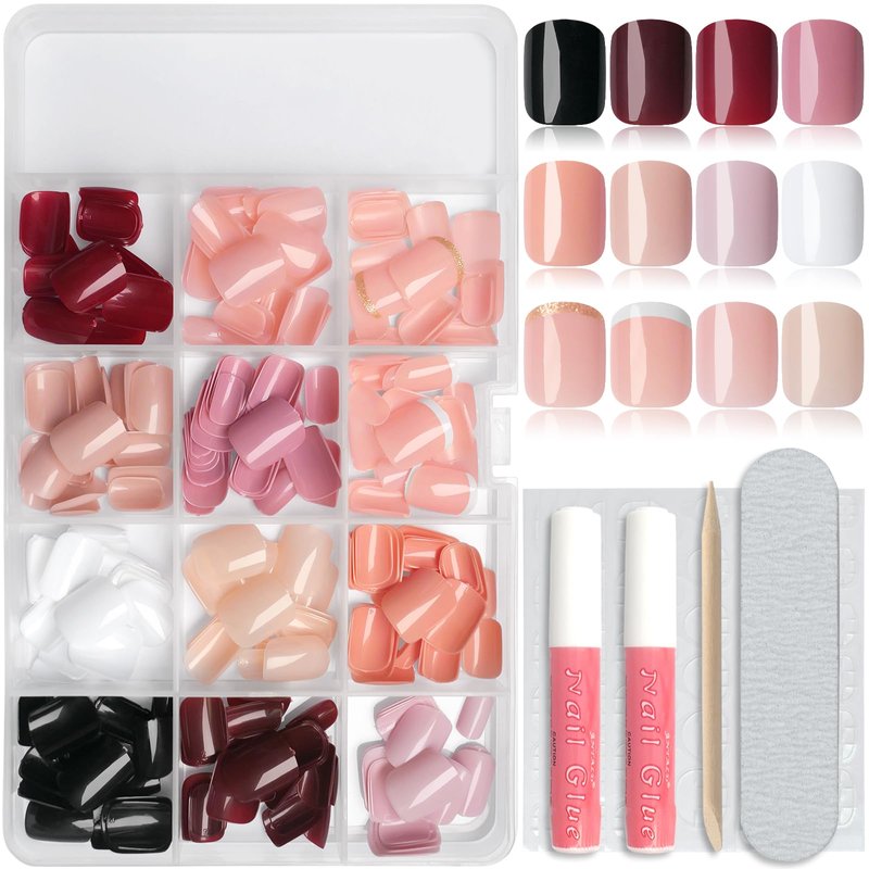 - Package Include: 12 packs 288pcs glossy short press on nails set, including 2 pack of french tip press on nails(gold and white french nails) and 10 packs solid colors colored fake nails, 1pcs nail sticks,1pcs nail file, 4 sheets 24pcs adhesive nail tabs and 2pcs 2g nail glue.All short fake nails and other manicure tools are packed in a transparent plastic box with 12 grids,easy for you to reach out. One sets includes 12 styles fake nails short and all you need essential tools to manicure.