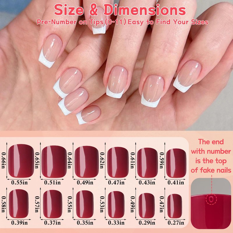- Glue on Nails Short Length: Square nails press on will not affect your normal life, which is the best choice for office lady and people who have to do typing or writing. Square nails press on big nail beds may look shorts, on small nail beds looks long. Please check nails tips size into get detail size measurements, and choose ideal nail set, or our nail tips can be reshape by cut and file the nails to get your ideal length and shape, perfect for nail lovers to DIY!