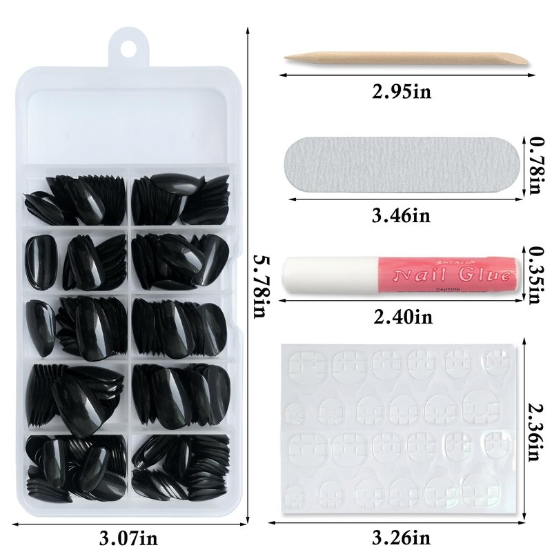 - Solid Color Almond Press on Nails Pack: Short press on nails kit come with 240pc glossy black color short almond shape press ons nails +5sheet nail adhesive sticky tabs+2pc nail glue+1pc 100/180 grit nail file tools+1pc wooden nail sticks. A complete nail art kit for women girls and kids at home manicure.