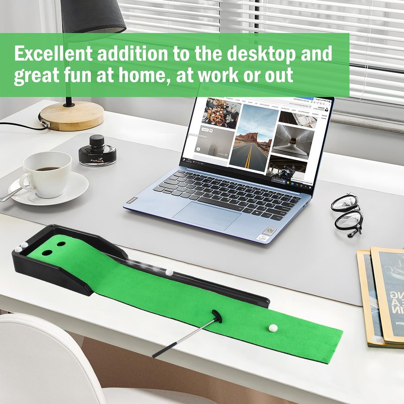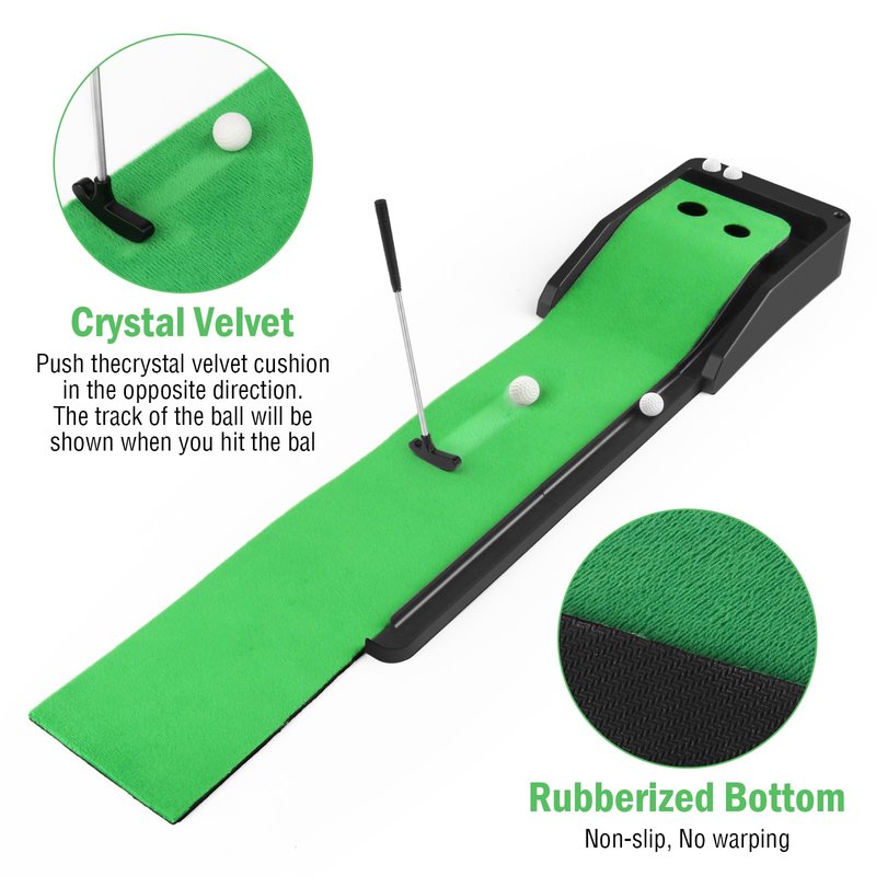 - Upgrade Design:This desktop golf putting green with a automatic ball return system can return the ball to the vicinity of the hitting point, effectively save your practice time, so that you are not tired. Mi-ni golf putting green designed with two holes of different sizes,lets you try games of different difficulty levels