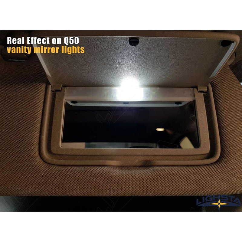 - Package Includes: Interior Dome Lights, Vanity Mirror Lights, Glove Box Lights, Door Lights, Trunk/Cargo Lights, License Plate Lights (10pcs LED bulbs total).(Please note the front map lights in the Q50 are stock LED from factory, they are soldered to a chip and board and cannot be replaced.)