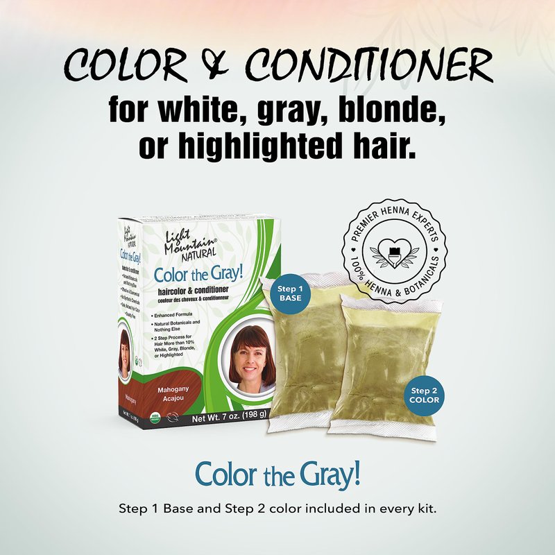 - TRANSFORM YOUR HAIR IN TWO STEPS: The 2-Step Light Mountain Naturals Color the Gray Hair Coloring Kit includes 3 ounces of the Step 1 base and 4 ounces of the Step 2 color powder, an instruction booklet, a cap, and a pair of gloves.