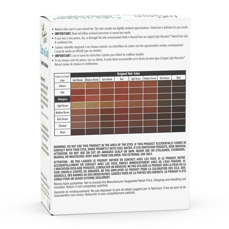 The Light Mountain Naturals Color the Gray Kit contains everything you need to add lustrous color to your hair while restoring body and shine.