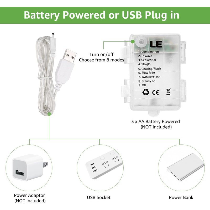 - USB Powered. Hook up the USB plug to a power bank. You can also plug in these curtain twinkle lights in a USB port hub outlet or use a regular USB phone charger base (not included)