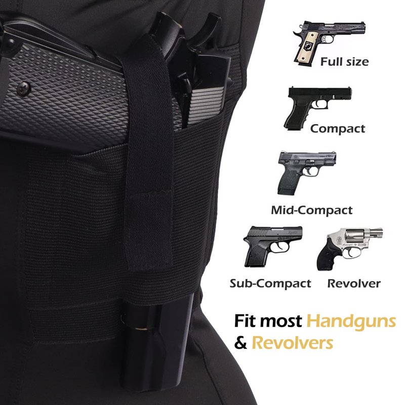 - ACCESSIBLE: Features two identical easy-access holsters, 1 under each arm,Securely holds all self-defense handguns,Unused pocket is perfect for extra magazines, documents or iPhone size device,The most comfortable concealed carry method for any self-defense handgun.