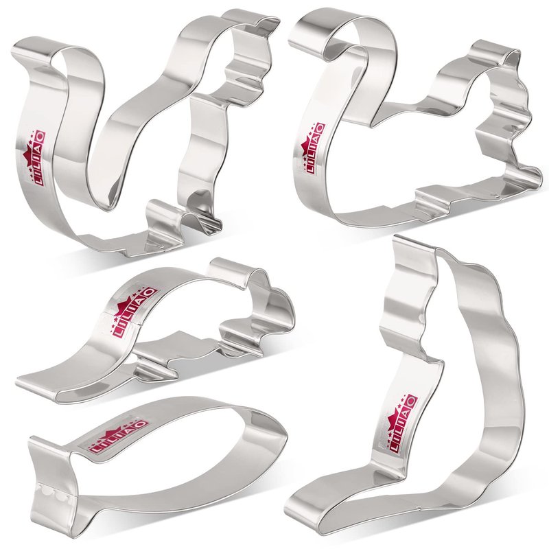 LILIAO Cat Cookie Cutter Set - 5 Piece - Curled Cat, Sitting Cat, Playing Cat, Mouse and Fish Biscuit Fondant Cutters - Stainless Steel