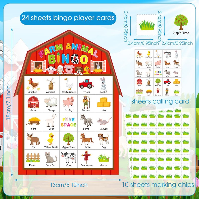 - Farm Game Set: the farm birthday bingo game set includes 24 pieces farm bingo player cards, 10 pieces player chips, and 1 sheet farm theme caller chip, the sufficient quantity offers a comprehensive kit for a fun and engaging time, which can allow 24 players for both children and adults of most ages
