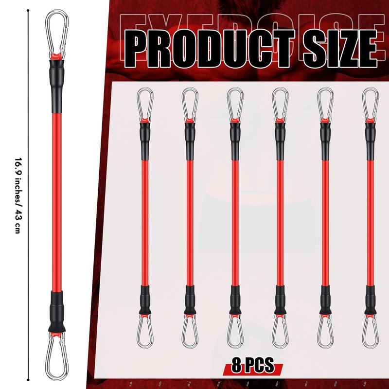 Features: Elastic workout bands can be sent to your family members, sports partners, team members, neighbors, classmates, relatives, and other fitness enthusiasts and beginners, to express your love and care for them, and enhance your relationship. Tension bands can fit many bars and other accessories, they are easy to put in your backpacks and sports bags, the solid structure can give you a good use experience. Specifications: Main material: latex, metal, synthetic fiber Main color: red Size: about 16.9 inches/ 43 cm Package includes: 8 x Additional exercise bands for replacement Notes: Manual measurement, please allow slight errors on size. The color may exist a slight difference due to different screen displays. Winding risk may exist, please keep away from little kids.
